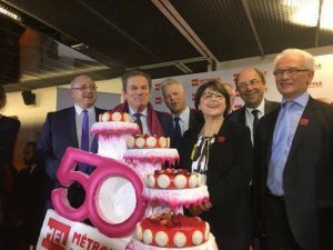 Cérémonie à l’occasion des 50 ans de la MEL de gauche a droite : Damien Castelain, Président de la MEL, Gérard CAUDRON, Vice président et président du groupe RC, Patrick GEENENS, Vice président et président du groupe PS, Martine AUBRY, Vice présidente et Maire de Lille, Max André PICK, Président du groupe MCU, et Bernard …