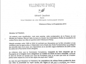 Villeneuve d’Ascq, le 25 septembre 2013 Monsieur le Président, J’ai entendu avec stupéfaction, mais sans surprise, votre condamnation de la France via son Ministre de l’Intérieur Manuel Valls à propos du dossier des implantations illicites de populations de culture Roms dans nos villes et quartiers (dont Villeneuve d’Ascq) Député européen entre 1989 et 2004 j’ai …